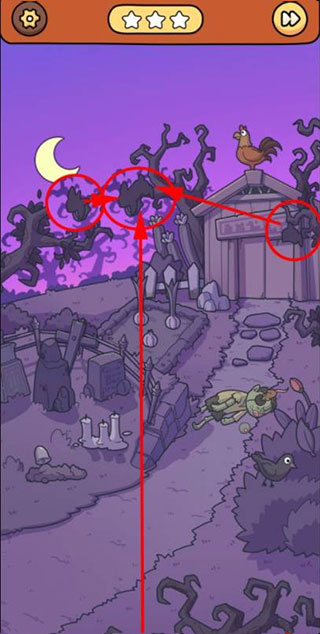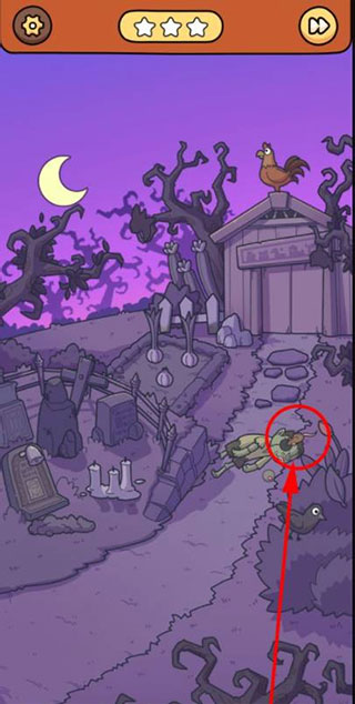 1、在小屋门口的菜园旁边有个挂铃铛的墓碑,点击墓碑上的铃铛,会出现闪电符号,点击符号收起。