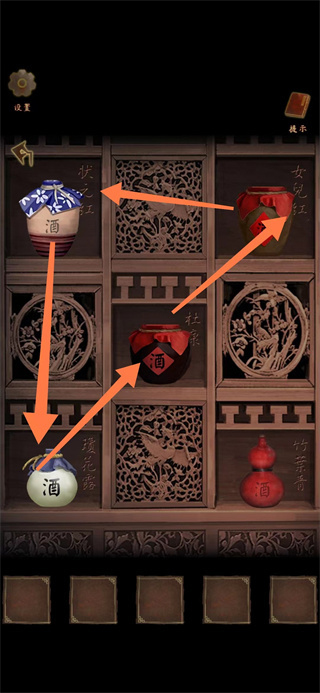 9、在查看凶案房间的酒架。这里需要玩家重新摆放【酒】,摆放的位置可以通过楼下的公告中了解。摆放位置如下图所示。