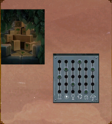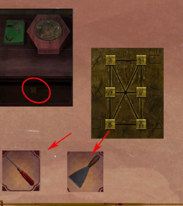 32、点击写字台的抽屉,根据前面获得的线索墙面上水流形成的几何图形与符号的对应关系,将机关滑块调整到正确的位置,抽屉向下划出,获得道具: 螺丝刀和铲刀。