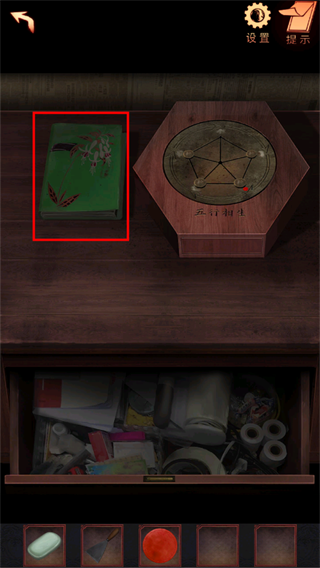 38、点击写字台上的六边形盒子,使用道具:金属滑块。根据笔记本上的线索,调整滑块到正确的位置,打开盒子,获得道具:钥匙。