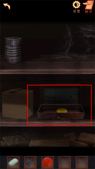 33、点击右下角的桌子,对着铁饼干盒字使用螺丝刀,打开盒子后获得道具: 红色圆块