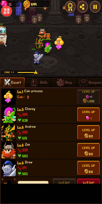 总体来说,游戏的玩法并不是很难,点击界面可获的金币,但这个等级与公主的等级息息相关,而根据解锁的技能,可为你缓解很多压力,例如攻击力、防御力的提升,治疗效果,以及金币翻滚等等。
