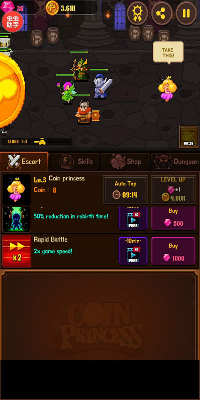 2、另外,为了方便玩家的操作,将以上画面向下滑动会弥留出一块空白区域,称之为控制区,点击便可让硬币公主不断的产生硬币,搜集硬币,让勇士们不断升级,或者招募更多的勇士守卫硬币公主,从而避免硬币公主被捉,同时升级硬币公主,还可以得到宝石作为奖励。