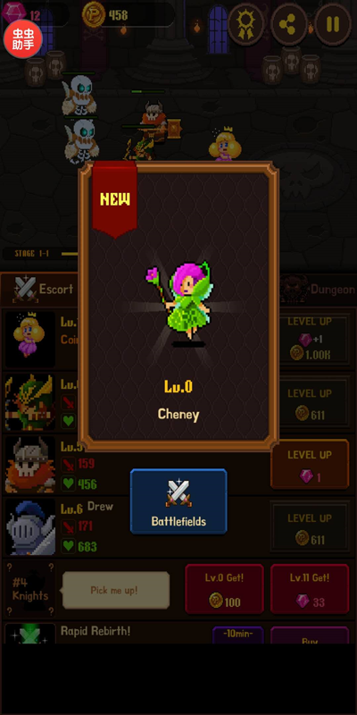 地下城是挂机的地方,在人不在的时候可以将护卫队派遣到里面去挂机获得金币。