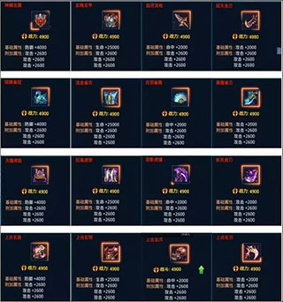 神器的附加属性有防御、生命、命中、攻击和闪避五种,这五种属性则是随机出现的。绿色品质神器只有一条附加属性,蓝色和紫色品质有两条附加属性,橙色和红色有三条附加属性。一般玩家穿戴的神器主要有紫色、橙色和红色三种品质,紫色的最高战力为2600,橙色的战力固定为3800,红色的战力固定为4900。