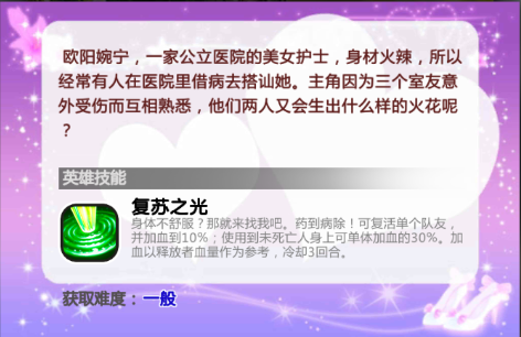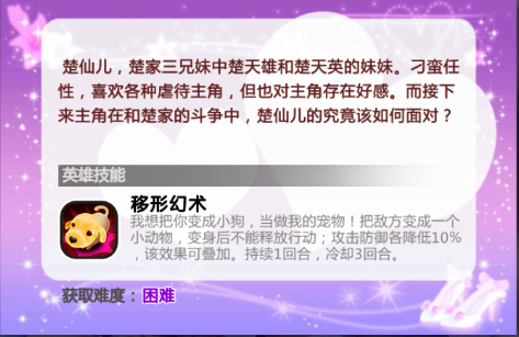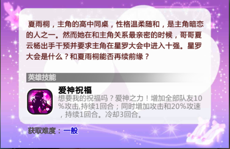 丁亚楠大招是群体封技,再加上本身不低的基础攻速,以及前期易得的英雄碎片,让她可以很容易的提升英雄图鉴,加上基础的防御属性也比较高,不需要花太多心思就能在前期给你很大的帮助。唯一美中不足的是她的大招法攻加成不是很高,所以到了后期不能作为主C的担当。当然由于大招的群体封技,到了后期在PVP时也能左右战局。