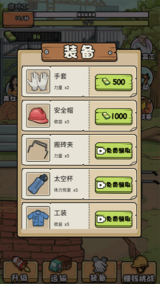 通过完成一系列任务并增加工作量可以获得更多报酬,获得各种设备,在持续的训练下提高搬砖的实力,获得执行任务的丰富回报。