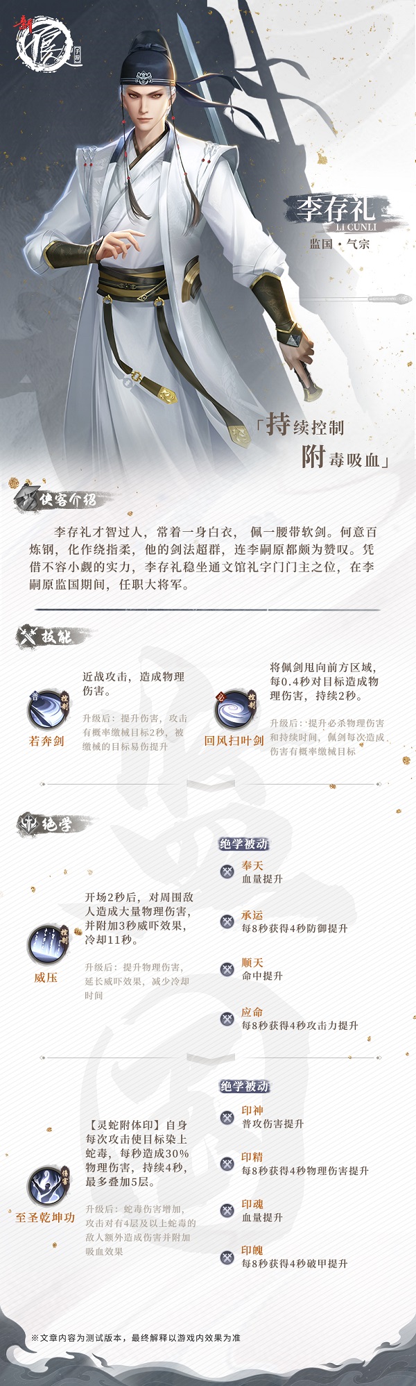 剩余位置的人选,我认为李存忠、倾国是最好的选择。因为万毒的技能和羁绊虽然好用,但是角色血防偏低,所以我们需要一些肉盾来为这些脆皮抗伤害。李存忠、倾国能激活2金刚羁绊,为队友和自己套盾,加之倾国的嘲讽技能,可以大幅提升整个阵容的生存能力。