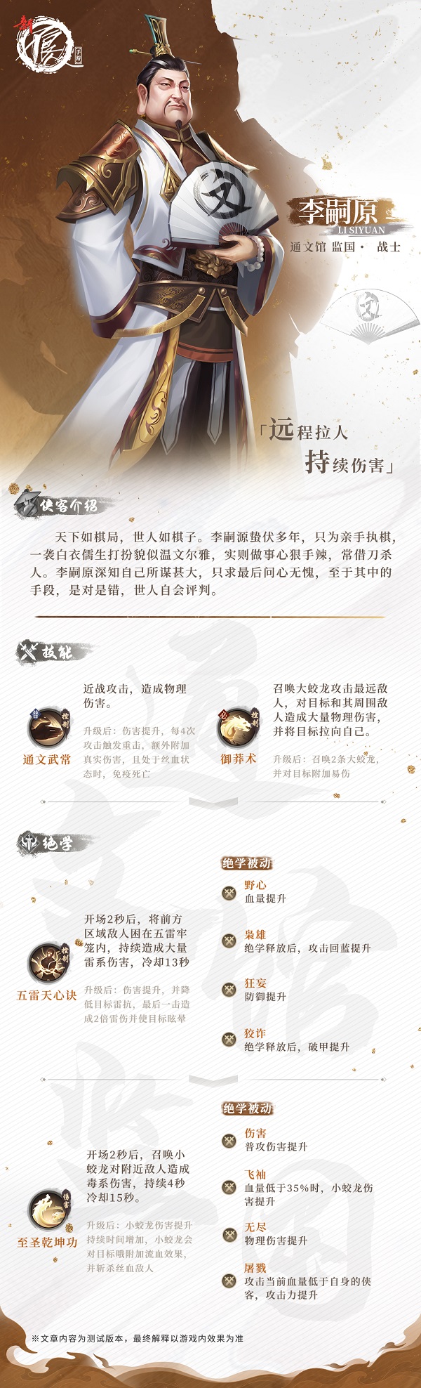 以「李嗣原」、「李克用」等人组成的通文馆阵营,多年的兄弟阋墙和明争暗斗并不损其实力,反而愈战愈强。该阵营在游戏中适合长线性战斗,在后期越残越强,打出爆发型伤害。