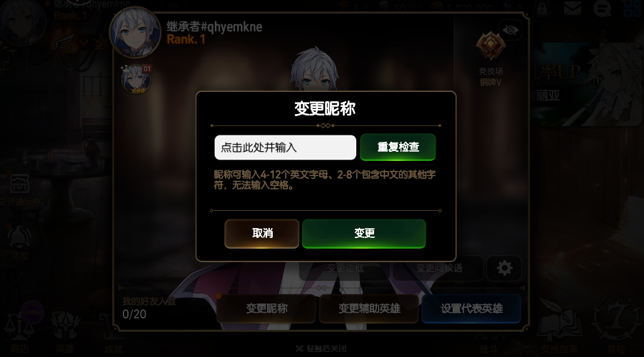 至于改名方法,很简单:点击头像,选变更昵称,输入新名字就行了。游戏的资源获取也算友好,新手还能获得钻石和自选券,不过抽卡系统还是有一定难度,尤其是光暗角色更难出。