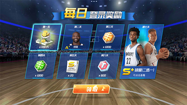 在游戏7天登录奖励中,玩家第二天登录就能获得易建联,累计7天登录就可以获得格里芬/保罗乔治/吉诺比利中的一个,他们可是非常稀有的S+球员哦!