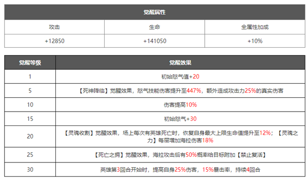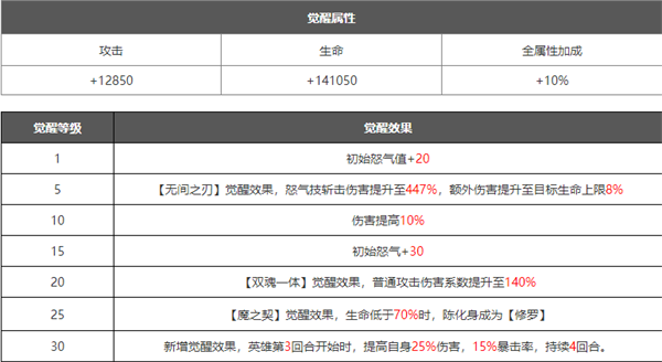 在角色培养到十星之后可以解锁觉醒界面,可以理解为花费资源升级觉醒等级,然后解锁更加强力的技能觉醒技能一般是在原有技能的基础上进行数值的增加,或者新增各种增益/减益效果,大部分都是被动技能解锁之后能大幅提升角色的战斗力。