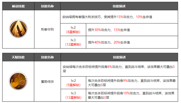 在角色培养到十星之后可以解锁觉醒界面,可以理解为花费资源升级觉醒等级,然后解锁更加强力的技能。觉醒技能一般是在原有技能的基础上进行数值的增加,或者新增各种增益/减益效果,大部分都是被动技能,解锁之后能大幅提升角色的战斗力。