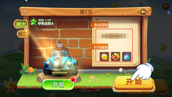 5、游戏采用的是闯关机制,每关都有不同的关卡目标和关卡掉落奖励,完成通关即可获得奖励,点击开始;