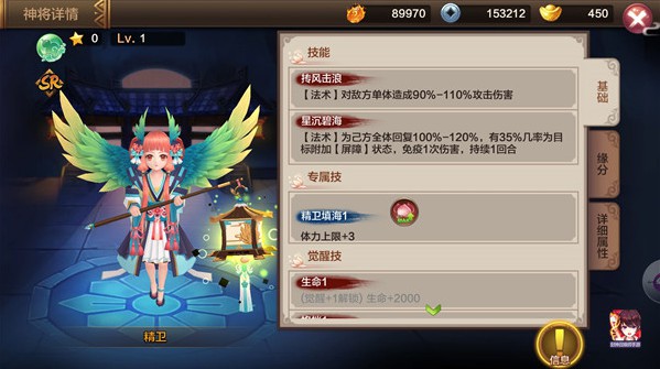 在神将详情的页面上可以看到神将觉醒的选项上,点开即可看到神将的身份信息以及攻防资料,通过觉醒面板上的功能按键可以看出觉醒前后的实力变化,从神将的生命、攻击、物防、法防等等将发生质的蜕变。