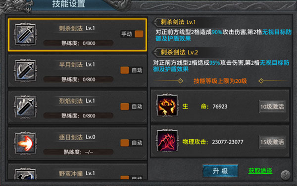 1、战士拥有刺杀剑法、半月剑法、烈焰剑法、逐日剑法、野蛮冲撞、无情怒冲、龙爪手、护体罡气、魔法盾、星陨火雨、十步一杀、施毒术、火龙召唤技能。