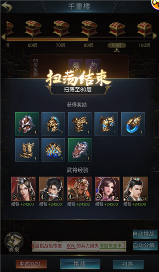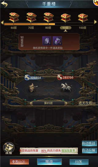 玩家战胜每层的重楼守卫都能获得一定的奖励,同时获得下一层的挑战资格。挑战的层数越高,守卫就越强大,奖励也会更加丰厚。通关指定层数,还有机会获得稀有武将装备与道具哦~