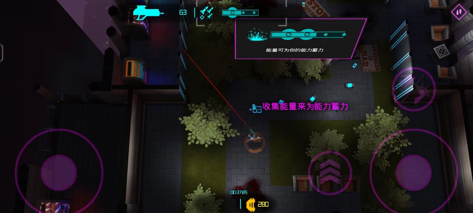 这个游戏叫朋克大暴走中文版,又名Neon Chrome,是个无限双摇杆自上而下的射击游戏,风格很赛博朋克,紫色和蓝色为主调,加上极简设计的图标和高科技建筑,感觉特别未来科幻。玩法挺简单的,就是一层层扫荡敌人,消灭所有威胁。游戏里有很多武器可选,每把都有特殊效果,还能利用地形掩护自己,但所有东西都能被摧毁,包括墙,这样既方便攻击也能增加危险性。