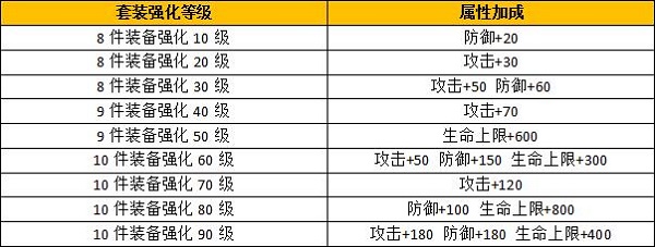 通过将装备强化至指定强化状态,可激活强化套装属性,强化套装考验的是玩家装备综合强化等级,通过提升整体强化等级激活更高阶的强化套装属性才能获得更高的角色战力。