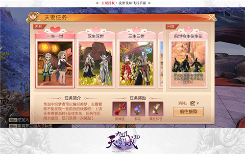 旅途漫漫,神仙眷侣总令众生艳羡。共赴奇途绝境,同战异类妖邪,生死与共方是夫妻同心。夫妻任务,共有三大系列任务、日常任务和三生石玩法。日常任务“前世今生往生花”,是孟婆委托你帮忙,找来制作孟婆汤的重要原料“往生花”。而收集往生花一般是有护花怪物阻拦的,夫妻二人需要打败它,就能收获往生花、良缘值、鲜花等奖励。