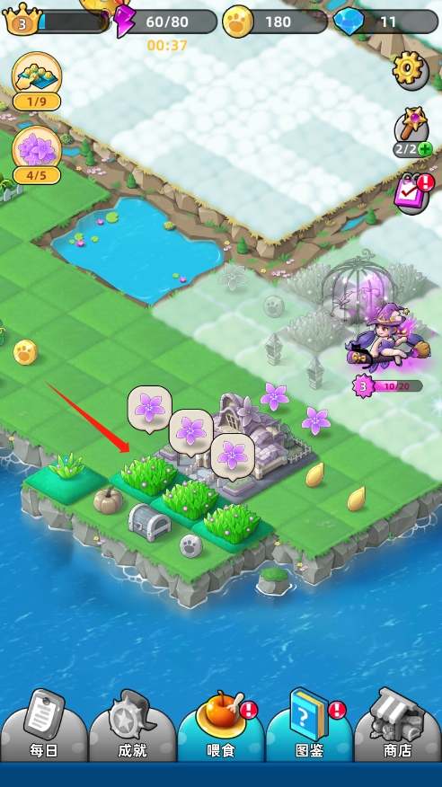 2、继续合并,可以发现新动物、新区域、新的物品,点击魔法球还可以攻击女巫,成功攻击女巫可以解锁区域;