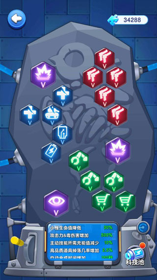 蓝色类做出两套,一套是减少小兵生命值的,一套是减少boss生命值的,这里需要讲的是出兵了就锁定了你科技数值,比如第四关出了兵后,那么可以换成减少boss的科技。到了第5关出boss那么可以切换成小兵科技。。有人说这可太麻烦了,那么这里就需要你经常挂机获取金币,来保持炮塔等级的领先,那么你就可以固定带三个五级小兵,两个五级boss,这样技能闪电鸡或者轰炸鸡可以随时留待使用。