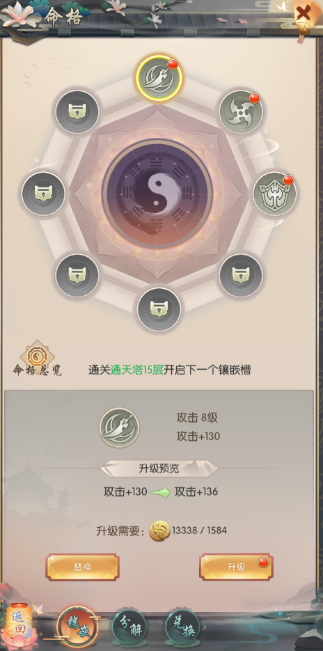 4、镶嵌的命格可使用命力值对其进行升级,等级越高加成的属性越高,命力值可通过分解多余的命格获得。