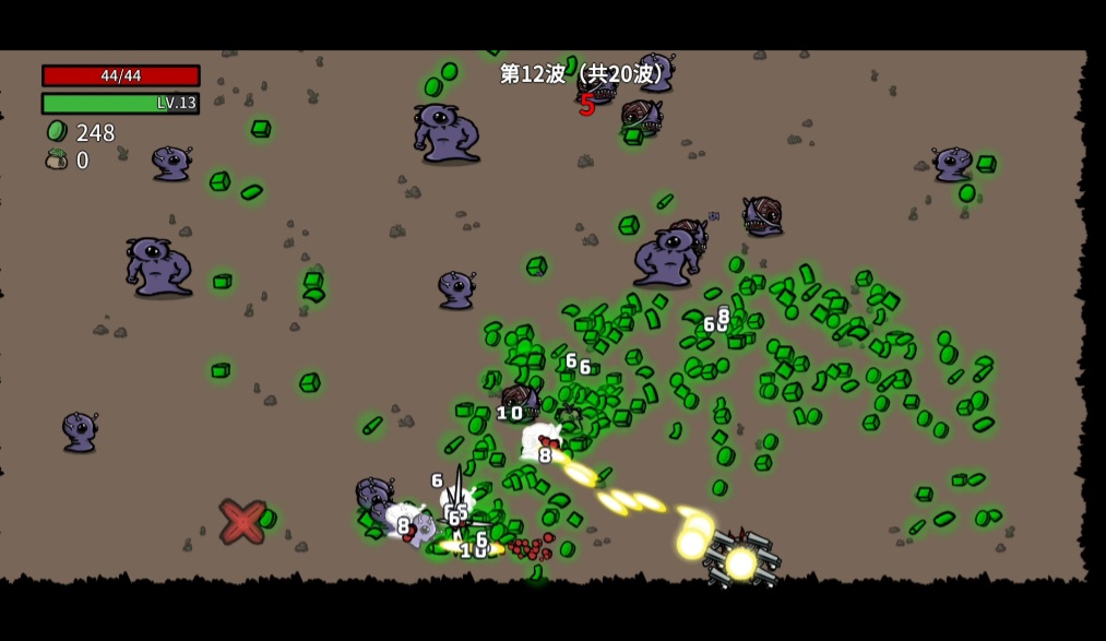 这个角色有两种主要的操作方式,一种是点按键盘使你在保持移动的情况下尽可能多的处于站立状态,具体操作就是站在原地然后弹幕或者冲锋哥来了你就动一下,有材料就向那边点按去吃,由此可以看出士兵这个角色最好多拿点移速,因为两米大长腿的动一下跟蜗牛的动一下是不一样的;另一种操作方式是走一段,停下来微调,一会儿再走一段,重复此过程。发育不好的情况下某些波次和打boss时需要这么操作。