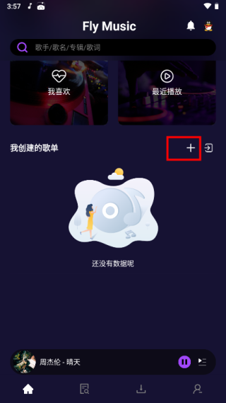 1、进入FlyMusic App,下划到歌单,点击图示的“+”;