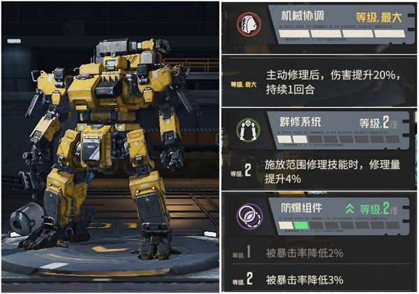 5、机体可改造并装备芯片。改造可提升机体的各项参数。芯片有【攻击】【防御】【支援】等类型,对应不同的插槽,相同机体也会因为插槽不同而有不同的芯片组合方式,再结合套装效果,即可玩转多种套路。