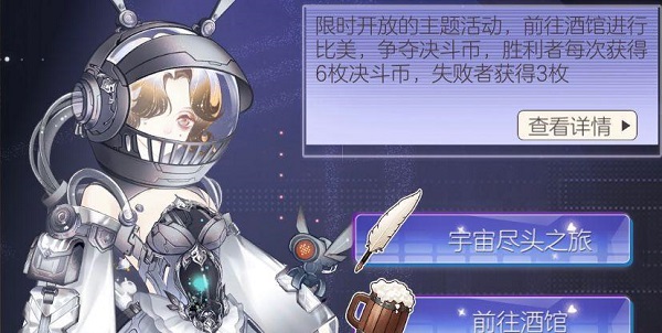 第一套衣服就是星海指引者,一共是有十个部件,每天限制三次在酒馆进行比美,酒馆是开放在贫民窟和上城区之间的酒馆,玩家可以通过在酒馆和其他人进行比美,之后就可以获得决斗币,不过,胜利的人可以获得六枚,而失败的人只能获得三枚。不过决斗币如果在这一次没有全部兑换完毕,也可以用于下一次的活动中去。