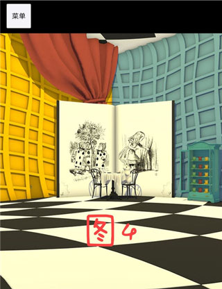 拿完钥匙后,来到图4。那本巨大的书的左下角有个黄色的门,先用闹钟吵醒把手再打开门。