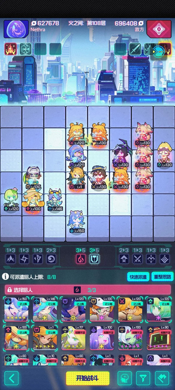 最右下角的是这个团队的核心可以看到水火土风都有的,右边三个是卡位置,送能量,以及不同元素塔元素要求用的。