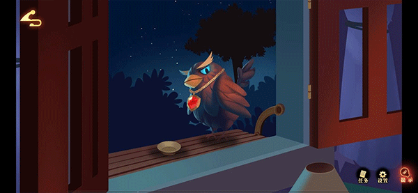 现在有“小碗”和“虫子”了,我们便可以打开窗户,将“小碗”放在窗台上,再将“虫子”放进去,此时乌鸦被自动吸引,我们便可以趁机取到乌鸦脖子上的“红宝石”。