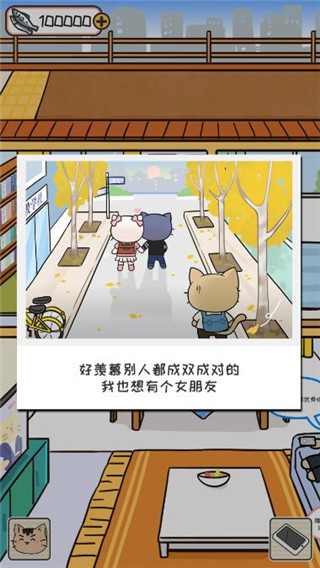 在这个游戏中,每个物品都可能对你的生活产生重大影响,你可能因为收到一份特别的礼物而获得新的工作机会,也可能因为某个偶然的机会而遇到你的另一半,从此开始新的生活篇章,你可以在游戏中不断地换工作,也可以谈恋爱,结婚生子,经历人生的各种百态,这个游戏充满了可能性和未知,让人期待不已。总的来说,离家的猫是一款非常有趣的放置养成游戏,它不仅有着独特的动漫风格,丰富的游戏内容,还充满了人文关怀和社会现实,如果你喜欢这种类型的游戏,那么离家的猫绝对值得你去下载体验一下。