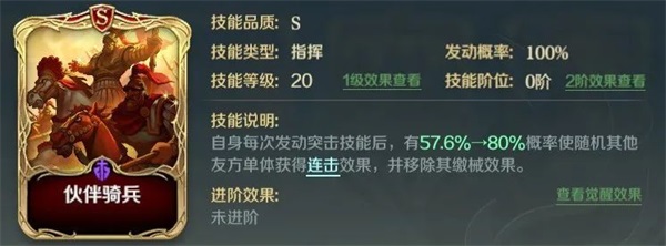 同时搭配上技能伙伴骑兵,稳定触发给友军叠加连击以及解除缴械效果。