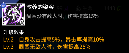 作为火力职业,洛瑞丝具有火力专属的职业被动,周围没有敌人时,伤害提高;跟其他火力一样,洛瑞丝应该尽量布置在远离敌人的位置上,以保证具有更强输出能力。专属中额外提供的攻击和暴击属性,完美适配了洛瑞丝暴力输出的定位。