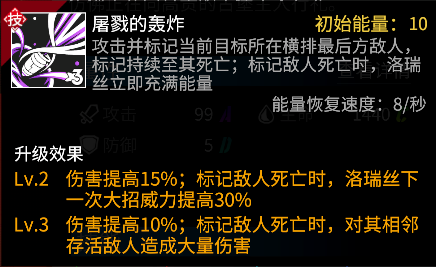 洛瑞丝会选择当前目标最后方的敌人进行攻击,跟山崎相同,绕过前排坦克直接攻击后方脆皮。洛瑞丝大招命中敌人后会施加标记,其死亡时会立即给洛瑞丝充满能量;极限情况下可从后往前连续收割一整个横排的敌人。大招升级后,标记目标死亡后会爆发群攻伤害,同时提高洛瑞丝下次大招的伤害,让连续收割变得更加容易触发。因为洛瑞丝的大招连续触发需要依赖尽快击杀后排,可搭配山崎或者卡缪来加快收割后排的节奏。