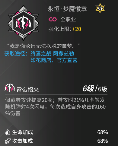 如前所述,洛瑞丝主要以堆叠攻击、暴击、暴击伤害属性为主,追求极限的输出能力,或选择奥义套装定向强化大招威力,提高连续收割的可能性;除此之外,也可选择效果命中或攻速属性提高被动触发的频率。徽章方面,梦魇徽章和魅影徽章都提供了洛瑞丝所需的攻速属性,能有效提高洛瑞丝被动触发频率,最为适配。