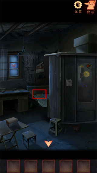 32、点击写字台的抽屉,根据前面获得的线索墙面上水流形成的几何图形与符号的对应关系,将机关滑块调整到正确的位置,抽屉向下划出,获得道具: 螺丝刀和铲刀。