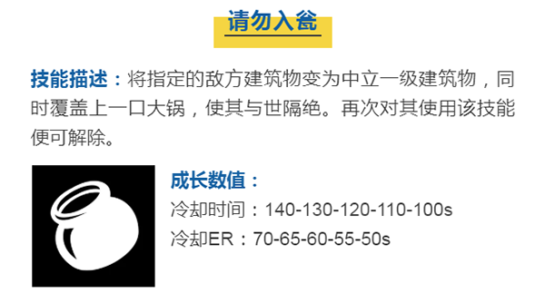 被盖住的建筑物会无法选中,同时变为中立,第二次使用该技能(无论作用于任何一座敌方建筑物),原有的被盖住的建筑都会释放(即战场只能有一个大锅的存在)。该技能仅可对有敌方士兵的建筑物使用,作用于敌方士兵最多的地方能够最大限度削弱敌方兵力。