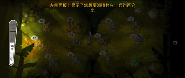 当首领拥有一定实力(人(菌)口)后,便可以调兵遣将向四周进行扩张。出征时,可以通过调节左侧的百分比进度条,选择不同建筑内想要派出的士兵数量比例(25%、50%、75、100%)