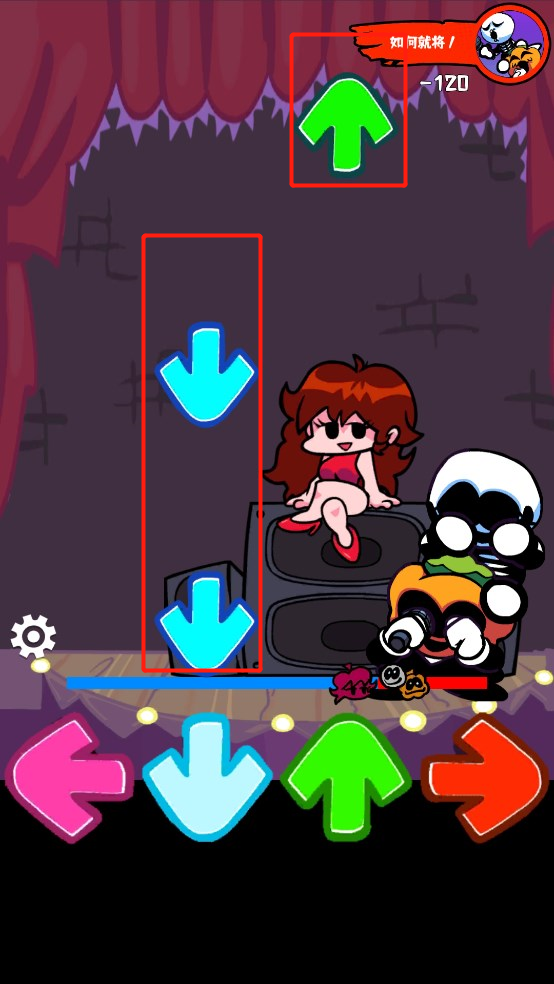 4、下面图中与下方固定箭头颜色一致的箭头下落时才是玩家的节奏部分,玩家需要等下落箭头与下方固定箭头重合时点击才会得分,否则早点或者晚点是不会加分的。