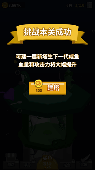 4、闯关成功后,建一层新塔生下一代咸鱼,血量和攻击力将大幅提升