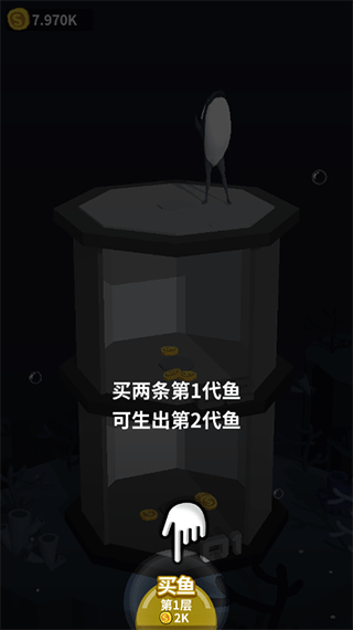 1、游戏开局需要不断的买鱼,买两条第一代鱼,可生出第二代鱼。