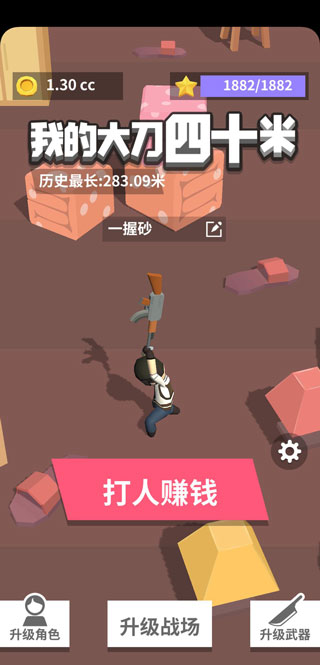 游戏规则很简单,每一关都要把对手都砍趴下才能升级武器,时间限制在两分钟内,谁的刀更长谁赢。最有趣的是联机模式,虽然匹配是随机的,但和其他人互砍还是挺欢乐的。角色和武器选择也很重要,等级越高解锁的角色越多,还能合成高级角色;武器锻造系统也挺有意思,花金币能打造更强力的装备。