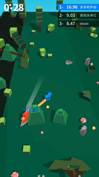 游戏还是比较简单休闲的,开局一把刀,后期也不一定是刀,有斧头、大棒等等都有可能,在这个局限的世界中不断的进行劈砍,无论是砍树还是砍人都能够增加你刀的长度,其中砍人会增加的比较多,砍树比较少,在2分之内,没有阵亡的玩家谁刀更长谁胜利。