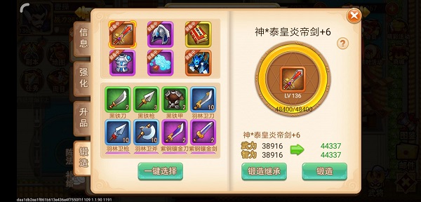锻造武器,有人地天神四个等级,朱雀套等等五种套和泰皇,二十四兵书先锻造,别的普通武器锻造人级别就行了,因为锻造不返还锻造值。肝帝可以无视,直接锻造到神。