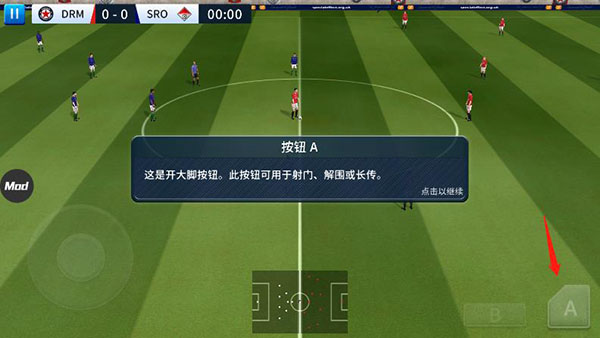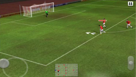 屏幕左下角是虚拟摇杆,操控带球队员的方向。而在射门时,小编推荐我们要使用右下角的“A”键。长按“A”键,队员头上会出现红色进度条,从无到满只有一次机会。进度条表示力度。力度越大,球速越快。