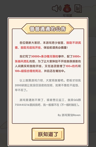 1、下载安装本站提供的我的开挂人生游戏,进入游戏后会看到游戏的公告;